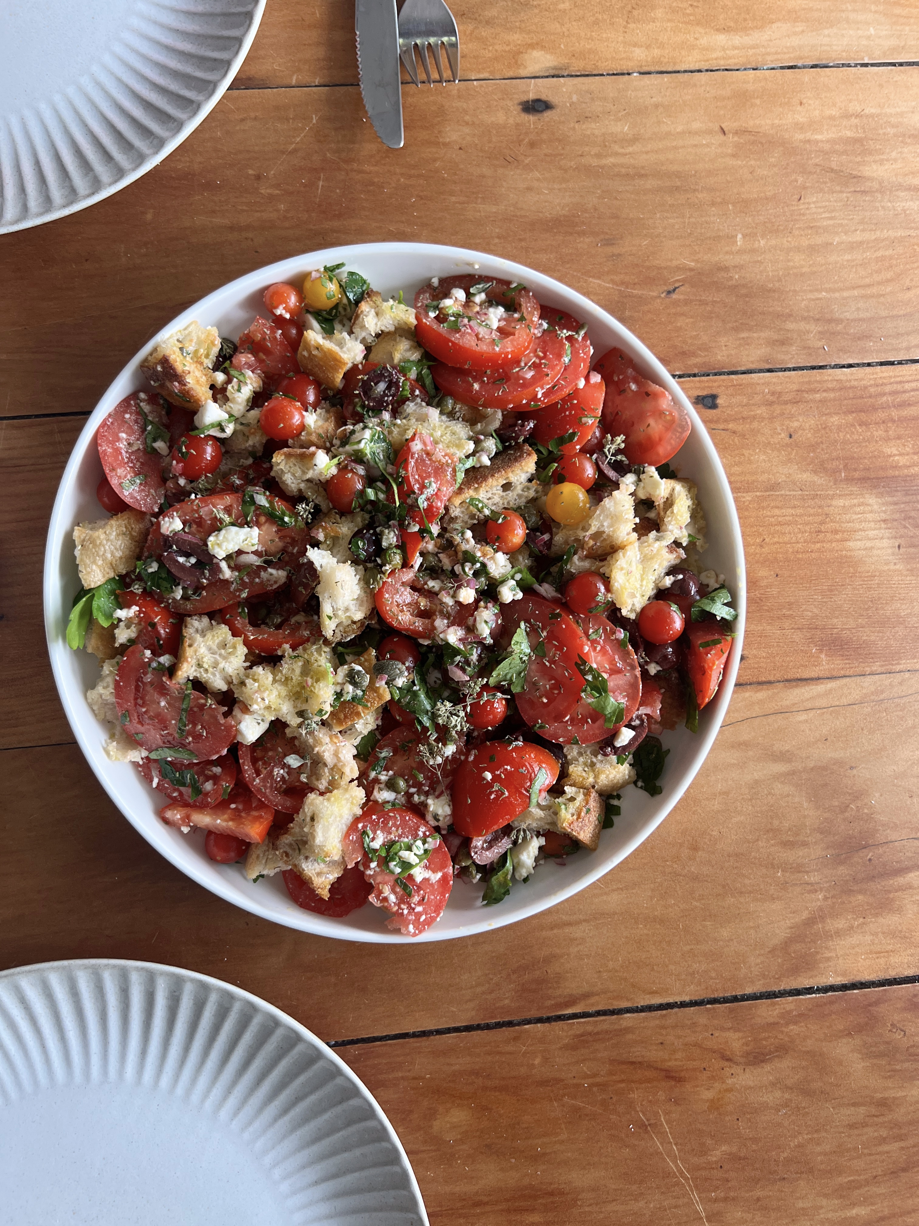 MoreThis salad is a celebration of summer with these plump tomatoes, the salty ingredients help it cut through the rich meats with some beautiful acidity from the lemon making it super moorish and able to stand on its own as a salad.